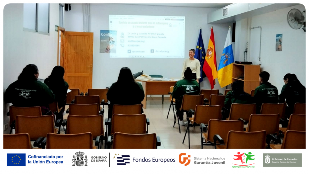 La Confederación Canaria de Empresarios (CCE) ha visitado al alumnado-trabajador del PFAE-GJ Atención Sociosanitaria Main 2024 con el objetivo de fomentar el espíritu emprendedor y ofrecer orientación especializada para la creación de iniciativas empresariales en el ámbito sociosanitario.