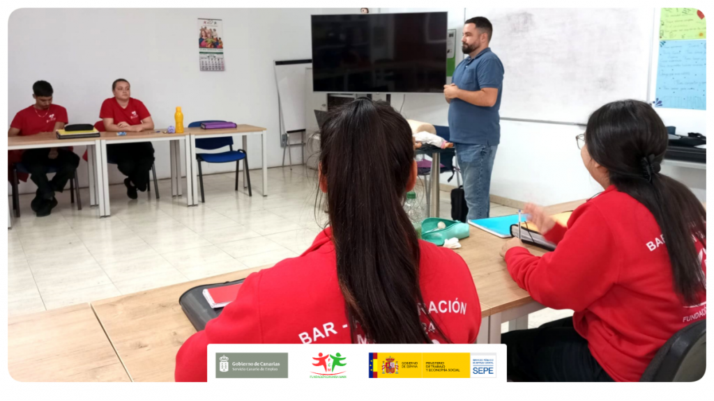 El alumnado-trabajador del PFAE Bar-Restauración Main 2024 ha recibido la formación en Prevención de Riesgos Laborales para el sector de la restauración, de la mano del docente Octavio .